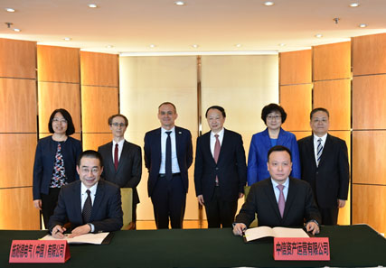 在中信集团董事长常振明、施耐德电气董事会主席兼首席执行官赵国华(Jean-Pascal Tricoire)、中信集团副总经理朱皋鸣、商务部欧洲司司长周晓燕、法国驻华使馆经济事务公使衔参赞Philippe Bouyoux、施耐德电气中国区首席财务官马晓云的共同见证下,中信资产运营副董事长兼总经理杨劲,施耐德电气全球执行副总裁兼中国区总裁尹正代表双方签字。